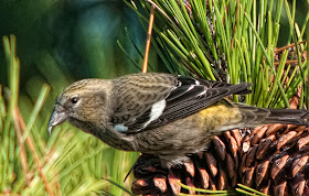 Adult male White-winged Crossbills look rosy as if dipped in red wine whereas immature males are peach-colored.